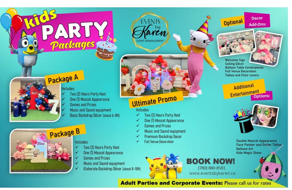 Events By Karen is a local company in Fort McMurray that offers event management services, from party packages, to custom planning, party equipment rental, and other party essentials.